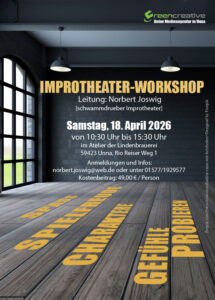 „Improtheater spielen ist weit mehr als gemeinsam Spaß auf der Bühne zu haben. Hier kannst du alles ausprobieren, wozu du dich im wahren Leben nie trauen würdest“ sagt Norbert Joswig, Gründer des weit über die Grenzen Unnas hinaus bekannten Schwammdrueber Improtheaters. „Die Lust am Scheitern und das Beschäftigen mit Gefühlen und Characteren stehen dabei ebenso im Vordergrund, wie das Erlernen von Techniken zur Szenenentwicklung.